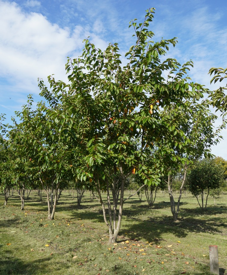 Prunus x yedoensis, Yoshinokers. Vrij hoge boom van 10-15 m hoog met opgaande takken, waarvan de uiteinden iets overhangen. Daardoor vrij brede, platte kroon. Het jonge blad is geelgroen. Bloeit in april zeer overvloedig met aanvankelijk roze, later witte geurende bloemen, enkelbloemig, 3 cm. Vruchten donkerrood tot bijna zwart. Gele herfstverkleuring. Mooie parkboom, ook voor bredere lanen op groenbermen.