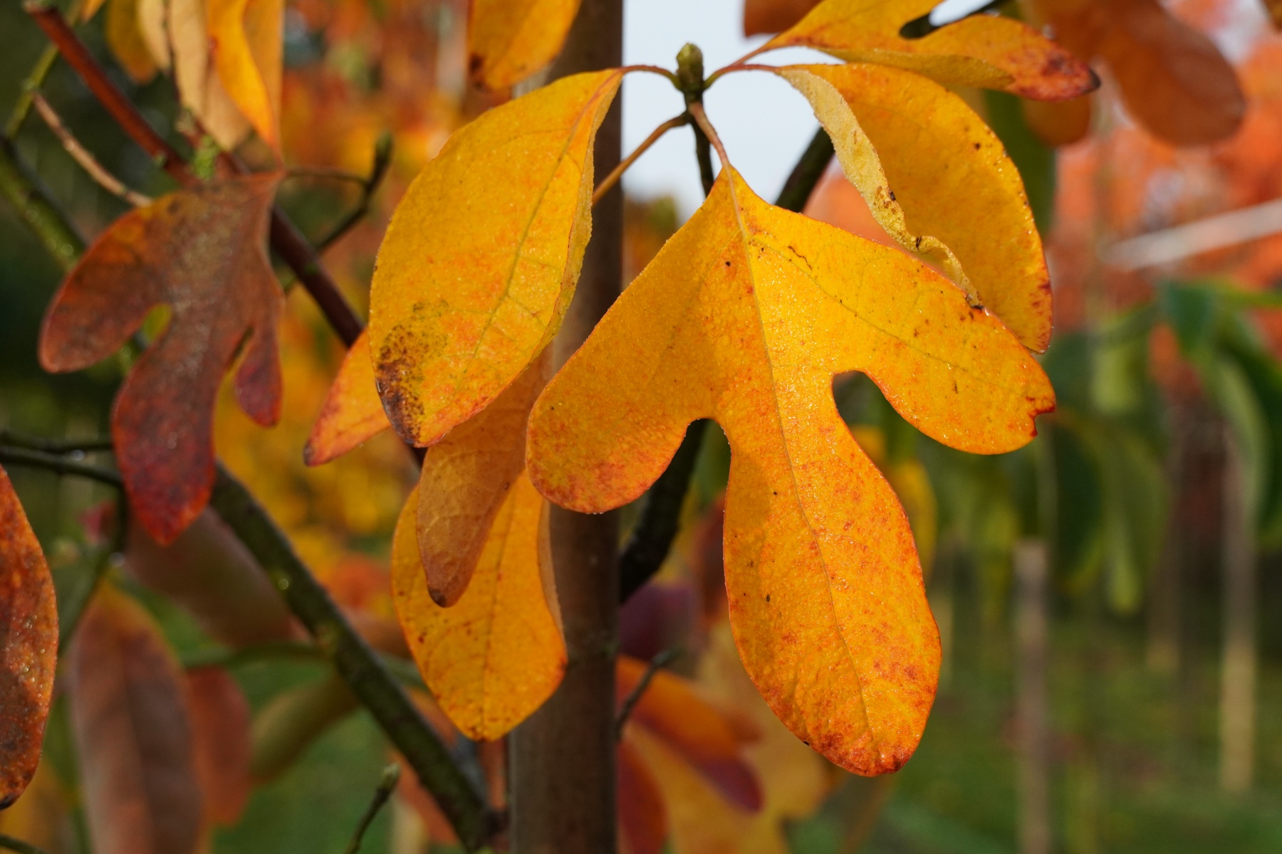 Sassafras albidum, Silky sassafras. Old tree, much too unknown. Generally a rising shrub, but can also be cultivated as a tree. Height 15-20 m. Strongly spreading main scaffold branches and slightly hanging side branches and twigs, creating a round crown. Trunk and branches brown-grey, bark cracks at a later age. 7-14 cm long and 6-10 cm wide leaf. Underside is greyish pilose and blue in colour. Orange-red autumn colouring. Blooms in May, with up to 5 cm long bunches of small and greenish-yellow flowers. Small fruits of up to 1 cm, oval, bluish-black.